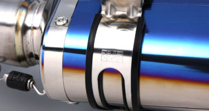 サイレンサーはSS(ステンレス)とSTB(チタン)の2種類から構成される。 どちらも板厚0.6mmと非常に軽量な仕様となっている。 巻き方は、ヨシムラ独自の変形トラぺゾイド。かつて4輪サイレンサーには使われた事はない独特な形状。一目でヨシムラ製だと分かるほどに美しく、軽快なデザインをしている。 両サイドのカバーは型からプレスされる専用品。この両サイドに膨らむアールを帯びたサイドカバーも一般通常品であれば味気の無いフラット鉄板で処理されてしまう。この点だけに於いても他社製と比較をすれば、その造形美に一旦を担うクオリティをお判り頂けると思う。