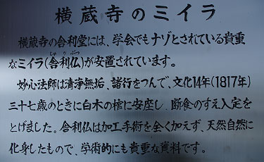- この看板によると、妙心法師が約200年前にミイラと化したらしい。ミイラを調べると、生きている状態で空腹状態になり、そこにうるしを流し込み、内蔵の風化を防いだという話もある。そんな話を聞くと、ミイラに会うのが、より恐ろしくなってしまう。しかし、ミイラは、すぐ目の前の建物の中・・・。ここは、腹をくくってミイラに会うしかない。ミイラを「ラーミー」と言って面白おかしく語っている番組があったが、それは、ミイラへの恐れを優しく緩和する行為だったのかもしれないと、今なら思える。
