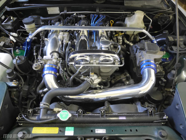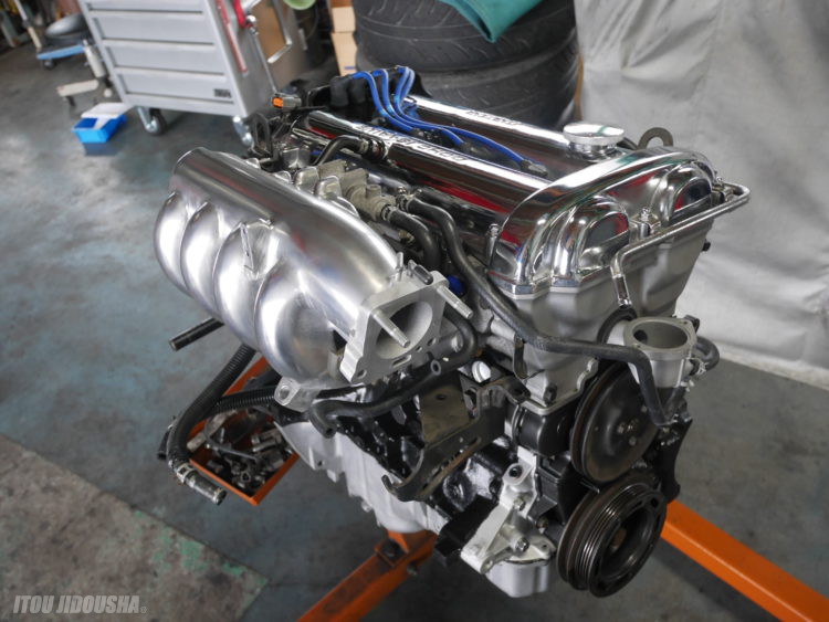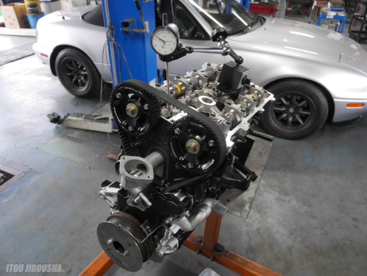 タイミングケース回り、インマニを取り付け。インジェクターはNB6用を使用して取り付け、あっと言う間にエンジンスタンドでの作業が終了。ここでお客様にエンジンが組み上がったのでと連絡を取りお車の入庫日を決めます。