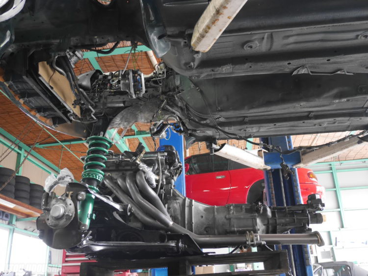 エンジンルーム内は搭載する前にお掃除をします。これで搭載の準備が出来ました。車両の方へエンジン・ミッション・サスペンションメンバー付きで搭載し順番に組み付けしていきます。