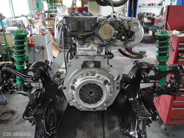 塗装後、エンジンマウントをセットしてスタンドからエンジンを取り付けます。軽量フライホイール・クラッチディスク・カバー、準備しておいたミッションを取り付けします。