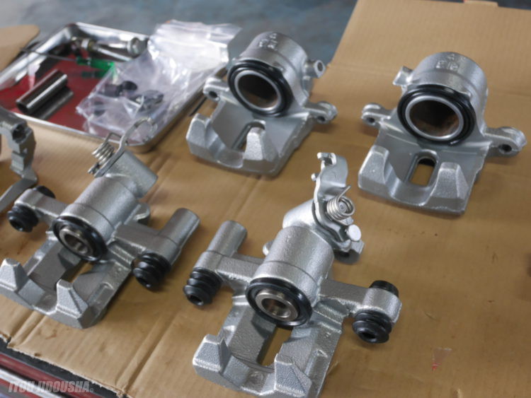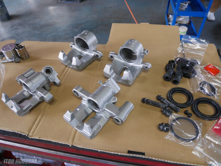 次はブレーキリフレッシュに入ります。4輪のキャリパー&キャリパーサポートを脱着。キャリパーを分解しウエットブラストで清掃。その後、業者さんへ耐熱塗装を出します。(焼き付け塗装)出来上がった所でキャリパーキットを使って組み付けします。今回ピストンは清掃して再使用です。