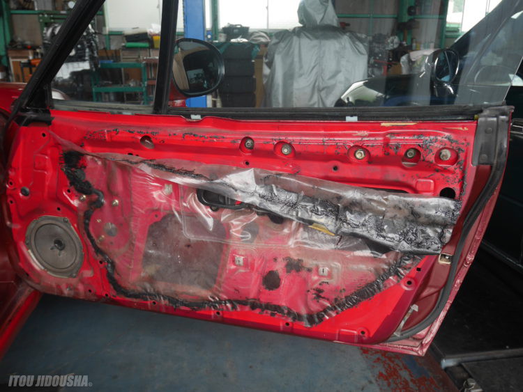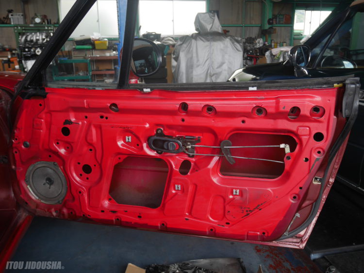 追加作業となったPWレギュレータ&モーターの交換に入ります。内張り・ドアガラス・PWレギュレーター&モーターを脱着。