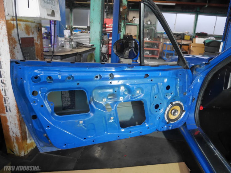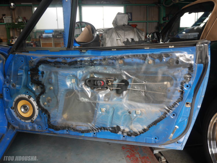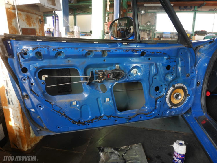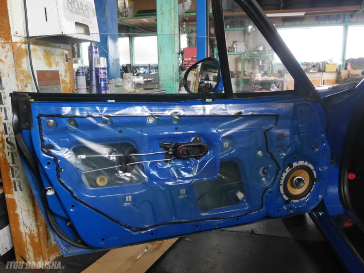 助手席側から作業を始めます。内張り・ドアガラス・PWレギュレータ&モーターを脱着。