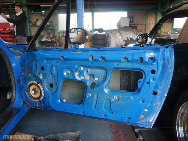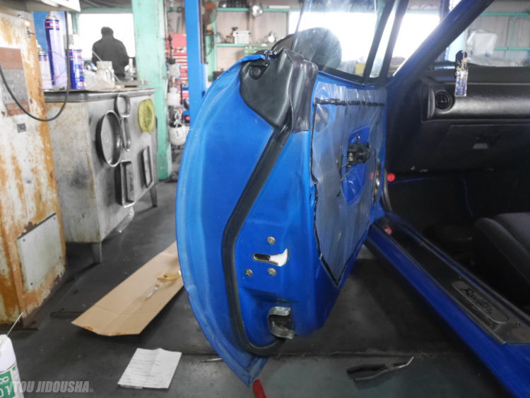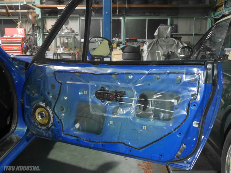 後は順番に組み付けていきます。ドアロック・マルハPWレギュレータ&モーター・ドアガイドレール樹脂カラー・ドアガラスを取り付け後、ドアガラスの調整をします。アウタウェザーストリップ・ドアスクリーンを取り付けして左は完成。