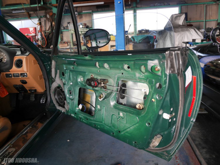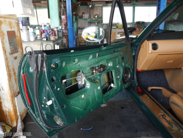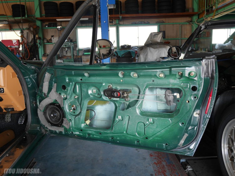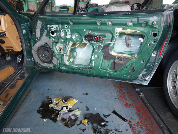 ドアウェザーストリップを交換後、ドアロック・PWレギュレーター&モーターを交換し、ガイドレールを掃除後ドアガラスを取り付けガラスの調整をします。その後、アウタウェザーストリップを交換。今回はオーナーさんが後からデットニングをするという事でドアスクリーンは付けずに内張り取り付けして作業終了となりました。