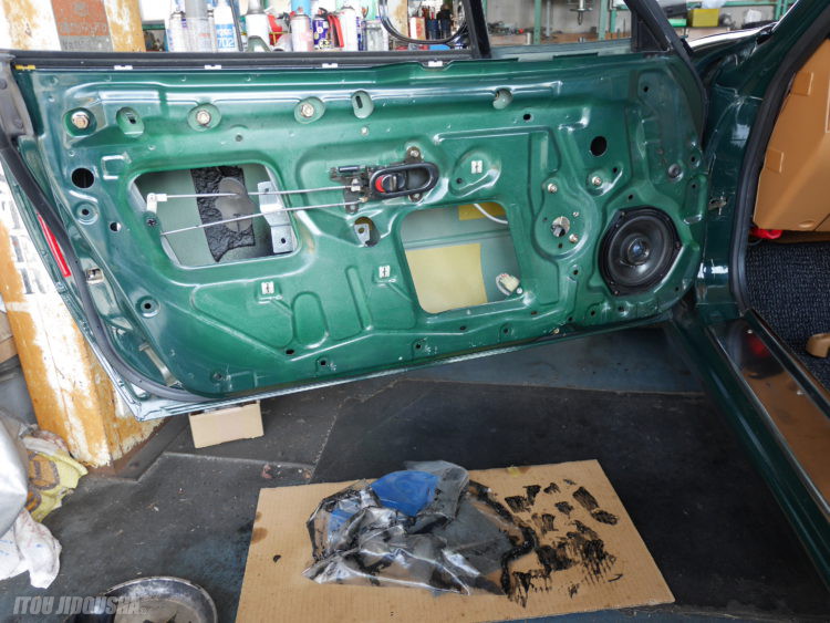 早速、作業入ります。運転席側の内張りを脱着すると空いている穴にデットニングがしてあり、これを外すして清掃するのに結構な時間がかかりました。