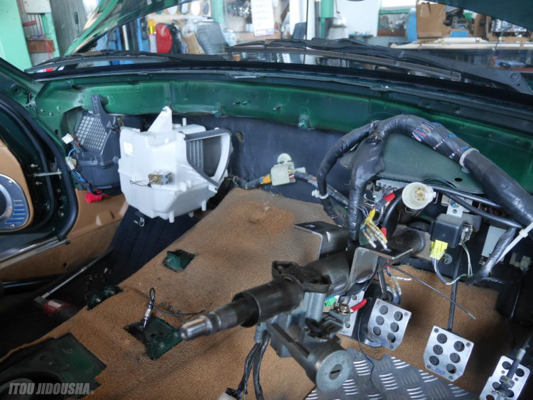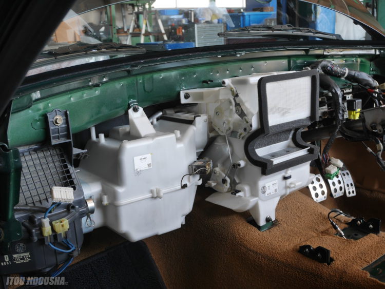 ダッシュボードを脱着しヒーターユニットを外します。ブロアモーターのスポンジはエアコンスワップ時におこなっていますので今回はそのままで。