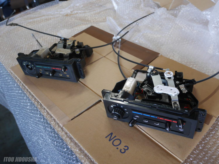 車両へと取り付けをしていきます。ヒーターコントロールを脱着した所、ケーブルの取り付け部分が破損しており、同時に交換をします。