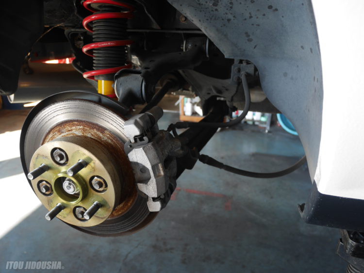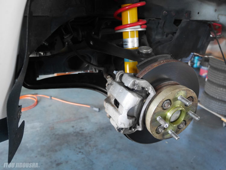 車両入庫で作業に入ります。ブレーキキャリパーを脱着しようとしたらすでにコンバージョンされていましたが、キャリパーはNA6の物。キャリパー塗装もメニューに入っていたのでNA8用のキャリパーで取り付けをします。