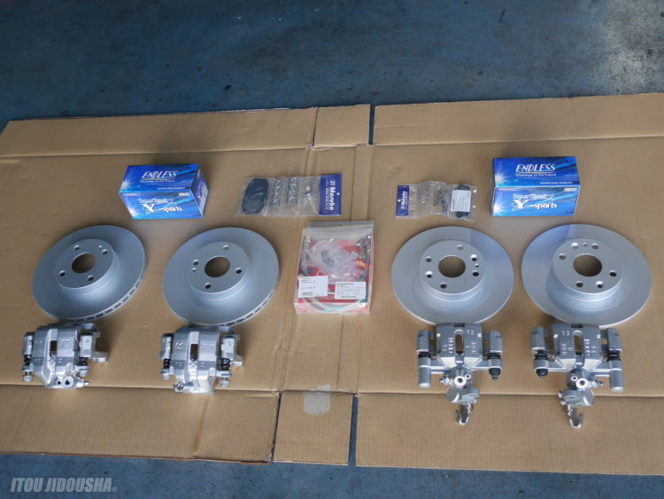 キャリパーは在庫で塗装済みを組み付けし、フロントディスクローター・ディスクパットを交換しブレーキホースも同時に交換します。