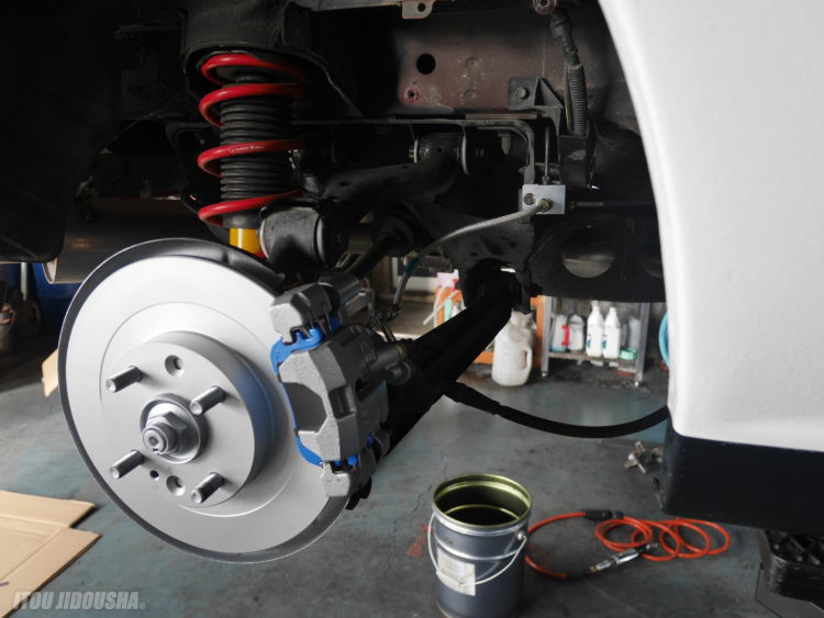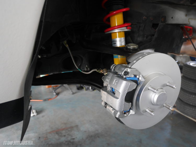 フロントと同様に塗装済みリヤキャリパーをキャリパーキットで組み付けし、ローター・パット・ブレーキホースを交換。4輪の作業が終了後、ブレーキエアー抜きをしてリフレッシュが終了です。(兵庫県芦屋市在住のお客様)
