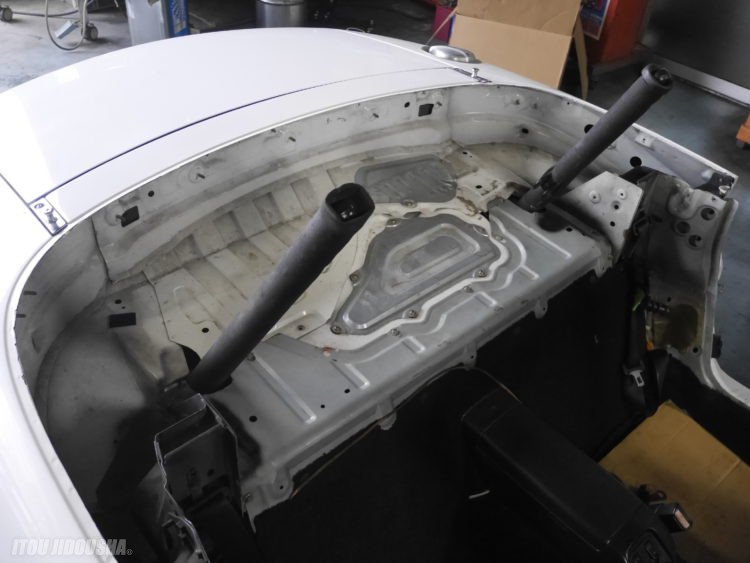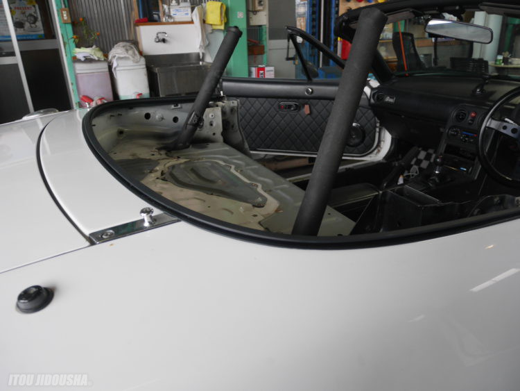入庫後、作業に入ります。左右のシート・ロールバーメインアーチを脱着し幌を外します。リヤベルトラインモールも同時に交換するため脱着し、ブチルを清掃します。