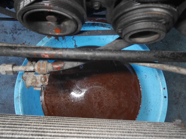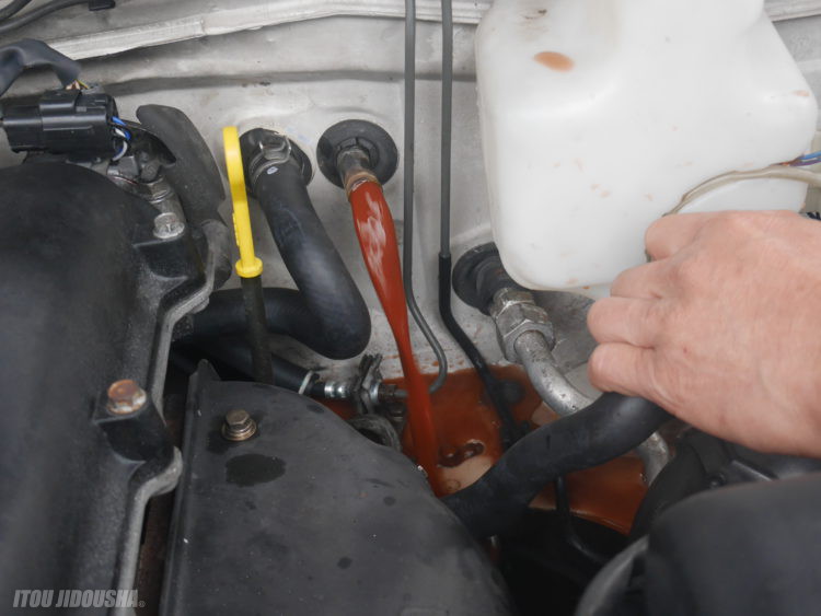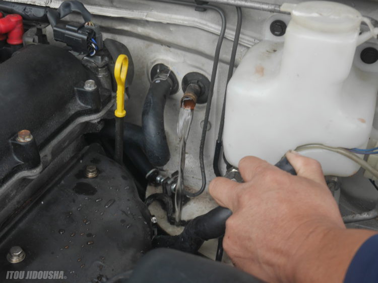 クーラントを入れる前にエンジン内部に真水を入れ循環させます。写真の通り、錆水がどんどん出ます。