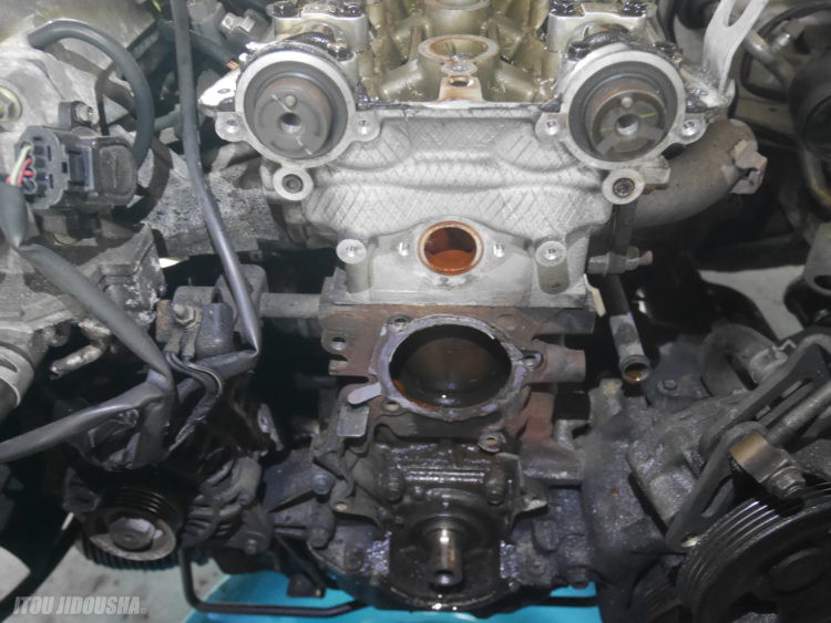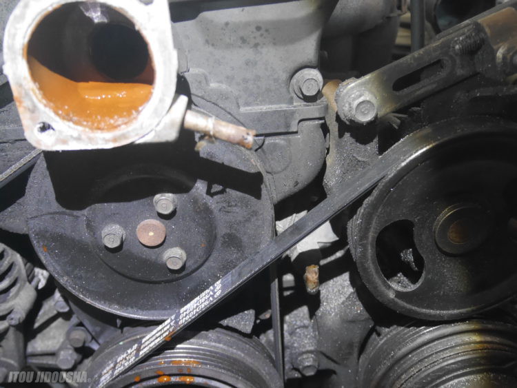 ヘッドカバー・タイミングケース・タイミングベルト・ウォーターポンプを脱着し清掃をします。取りあえず、この状態で出来るだけ茶色い水を綺麗にします。
