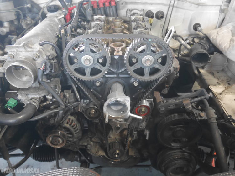 タイミングベルトを取り付けし、張りを調整。一挙に残りを組み付けします。