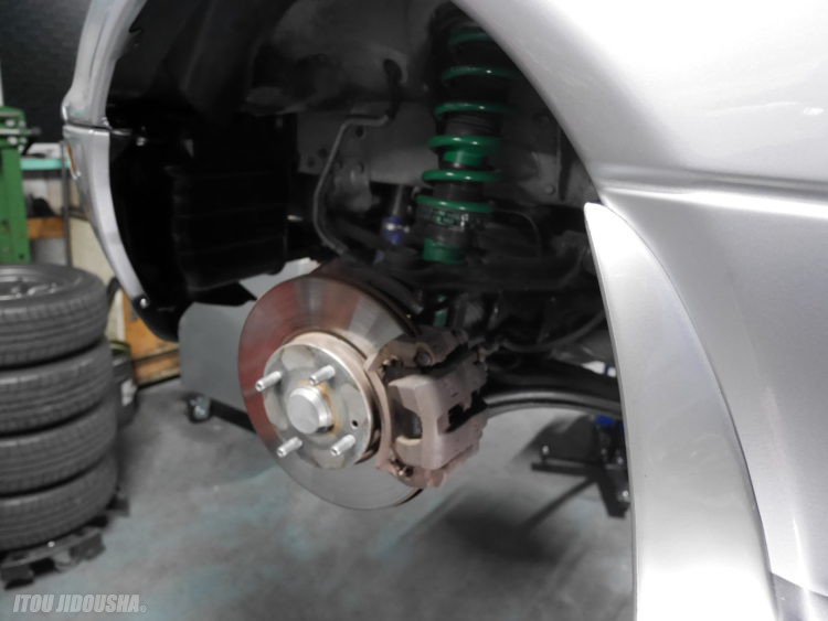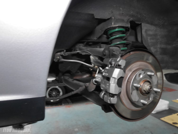 リヤも同様に組み付けします。ブレーキホースはスーパーロックラインへと同時に交換し、ブレーキエアー抜きをして作業終了です。次はタイミングベルト交換へは入ります。(兵庫県神戸市在住のお客様)