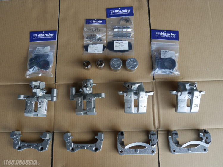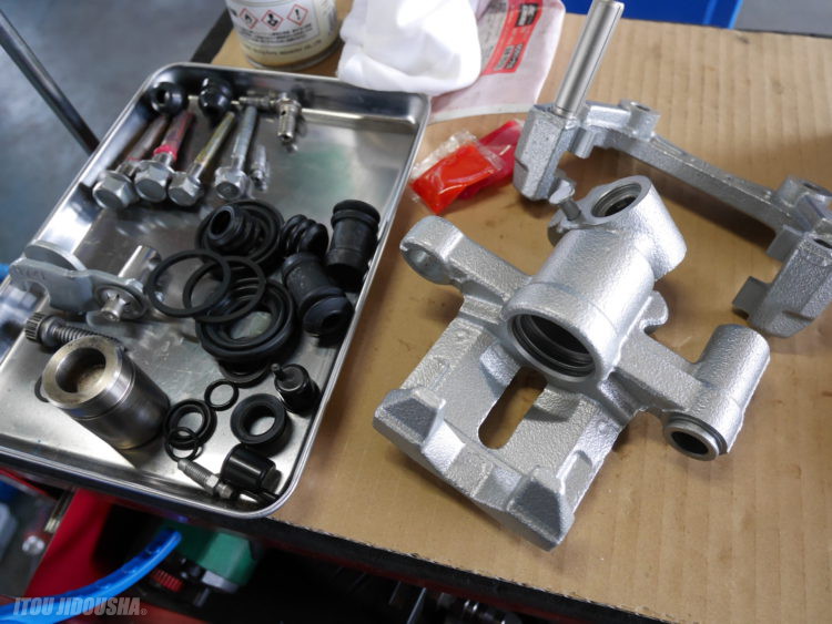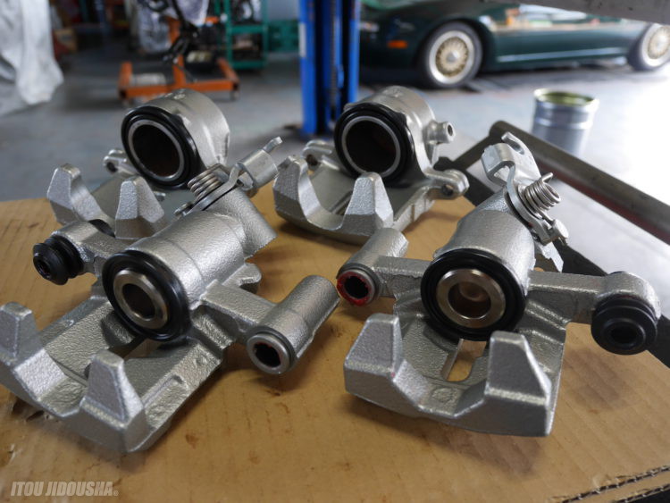 4輪のキャリパー&キャリパーサポートを脱着し分解。ウエットブラストで清掃後、耐熱塗装へと出します。その後、キャリパーキットを使って組み付けをします。