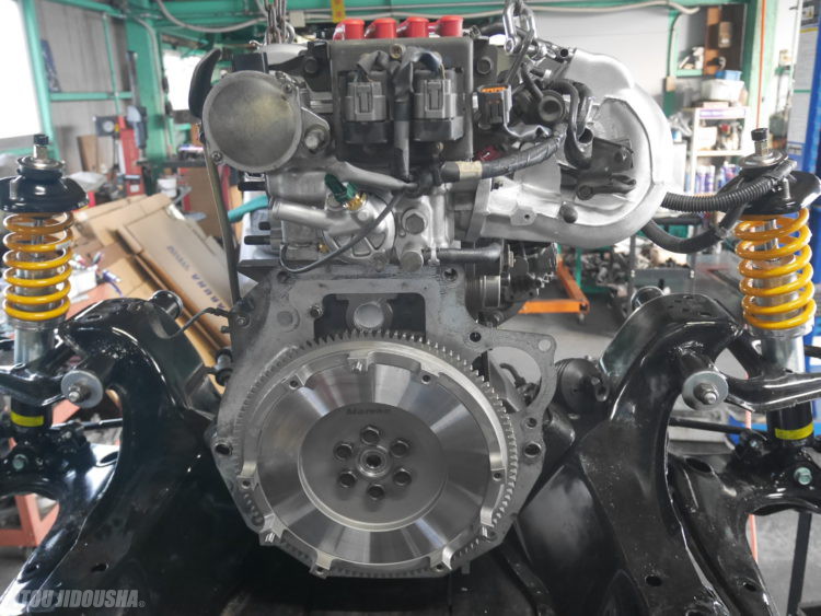 途中の写真を忘れましたが、インマニ・インジェクター・オルタネータを取り付けし、エンジンスタンドでの組み付けは終了。サスペンションメンバーへと移動します。エンジンマウントを取り付け、軽量フライホイール・クラッチディスク・カバーを取り付けます。
