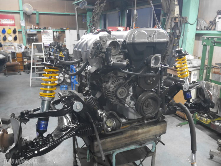 MTミッションは前もって清掃後、フロントオイルシール・フロントカバーガスケット・リヤオイルシールを交換しレリーズベアリングを取り付け、準備はしてあったのでそのままミッションを挿入します。エキマニ、フロント車高調を取り付けし乗せる準備が出来ました。