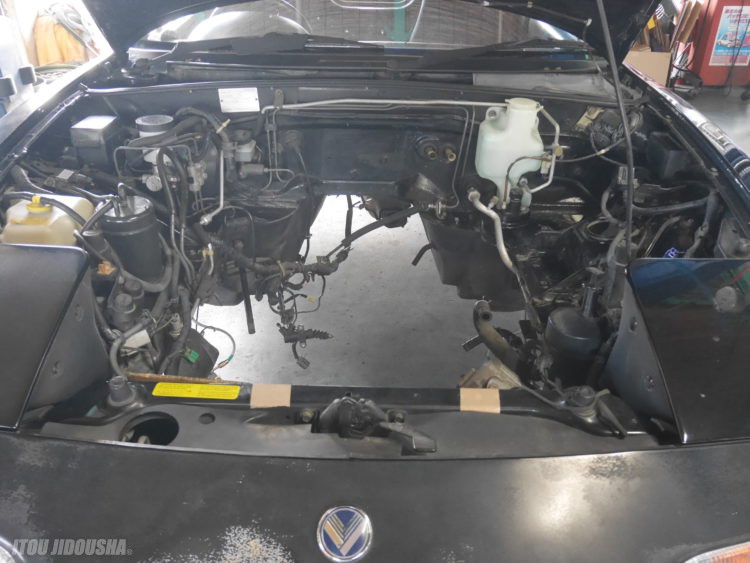 エンジンルームの清掃をして車両へとエンジンを搭載します。