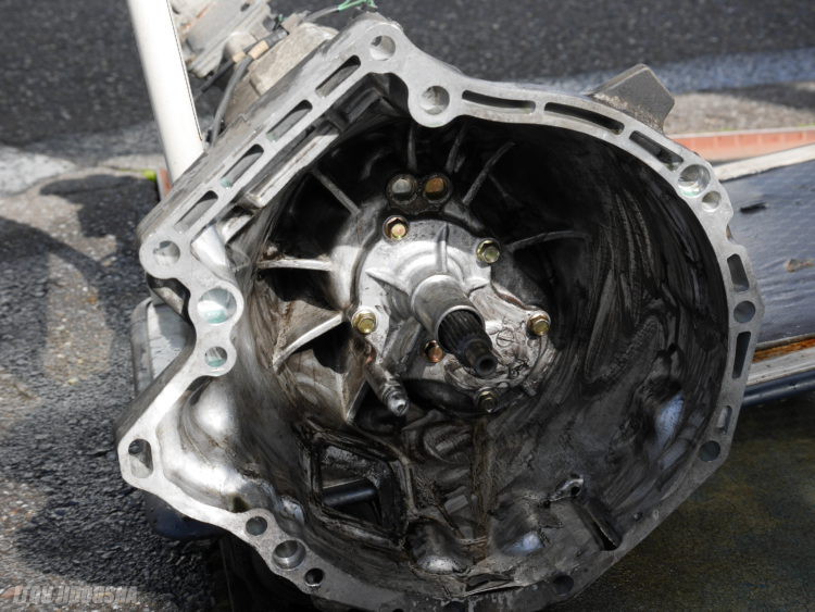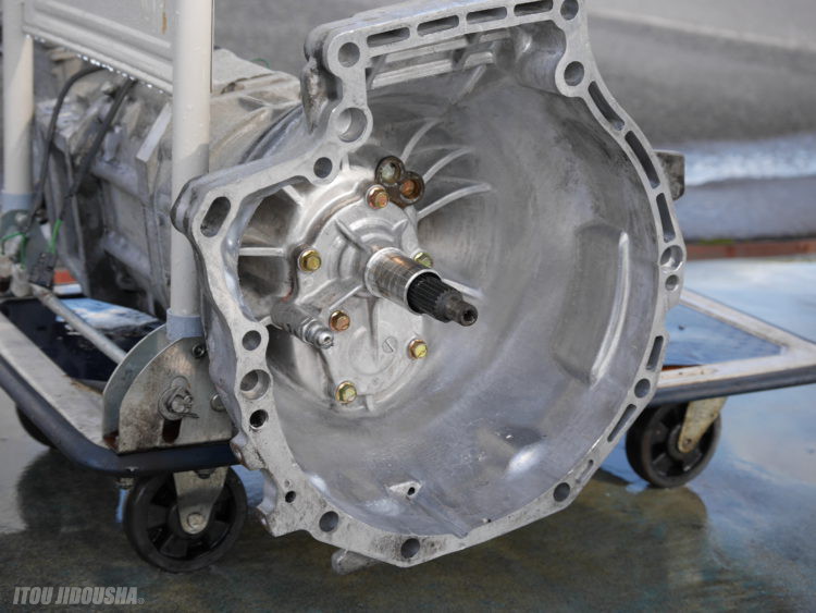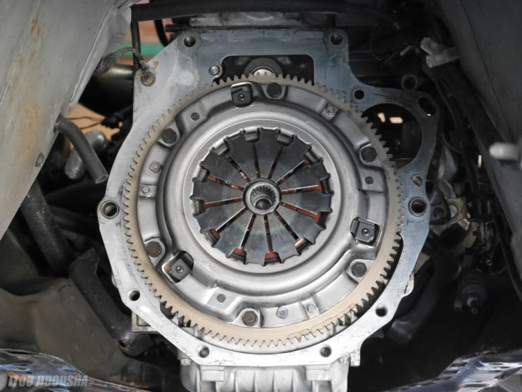 クランクテールオイルシールを交換後、フライホイール・クラッチディスク・カバーを取り付け、準備Okのミッションを搭載して作業終了です。