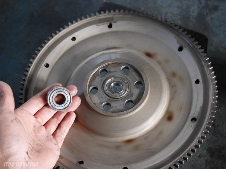 サクッとミッションを脱着。クラッチカバー・ディスク・フライホイールを脱着しパイロットベアリングを交換します。パイロットベアリングは引っかかる感じでした。