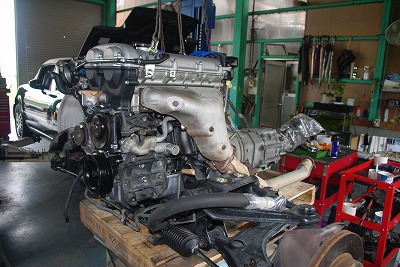 まずは、エンジン・ミッション付きで車両から脱着します。