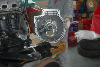 前もって、ミッションはスチーム洗浄してレリーベアりングを組んでおいたので取り付けします。
