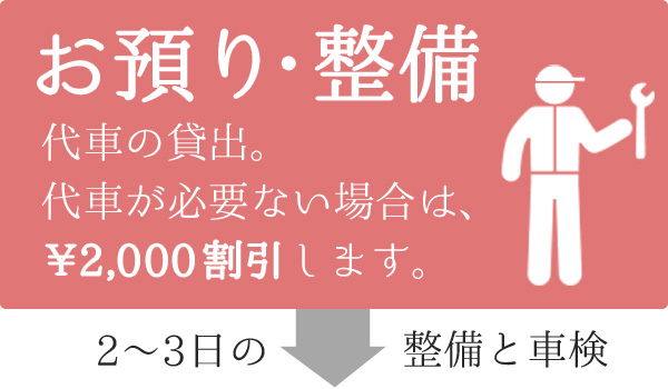 お車をお預かりして整備・車検取得を行います。2~3日を目処にご納車いたします。代車の貸出も同時に行いますが、必要ない場合は\2,000の割引を行います。